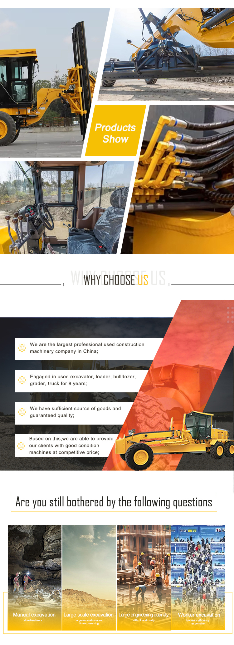 A3: This is a Shandong-based machinery company which specializes in exporting used machines,including excavators,loaders, road rollers,Land leveler, bulldozer etc.Send us any brand and model you need, and we will search for it for you.